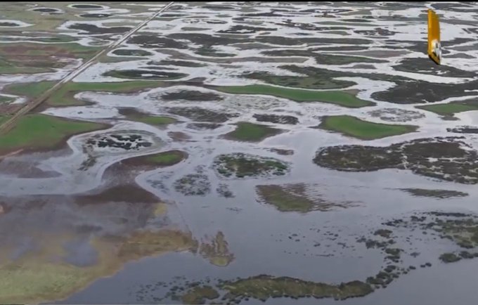 Esto es Hortensia, partido de Carlos Casares. Canalizan sin hacer las obras aguas abajo, tapan de agua a Ordoqui, Bacacay, 12 Octubre y ahí la vamos a aguantar porque no hay como darle curso hacia el Salado. LA ANARQUIA DEL AGUA..